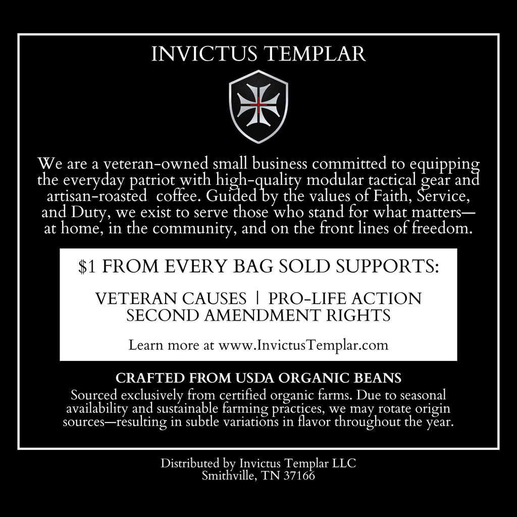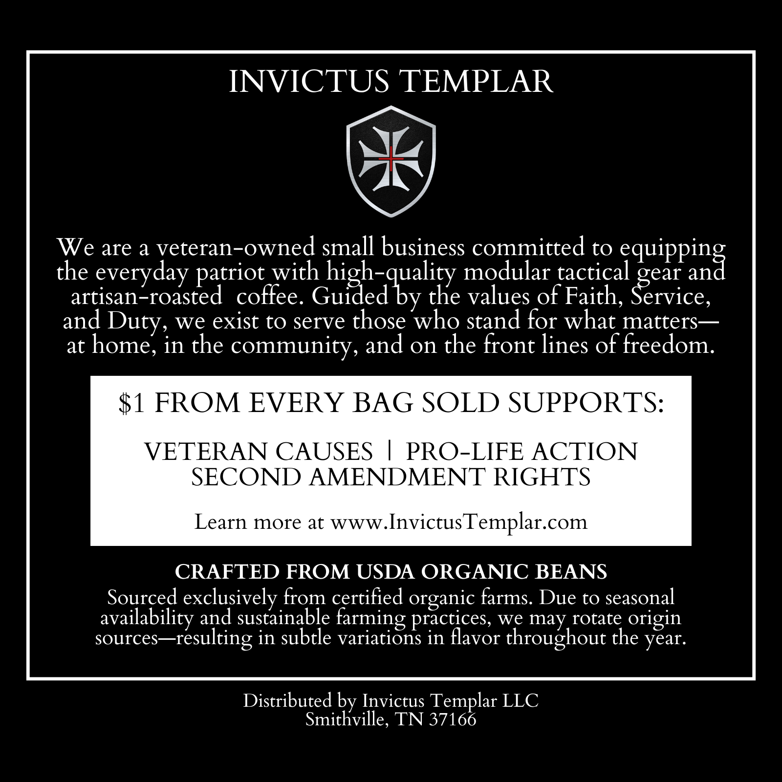 A layered fusion of light and dark roasts with smooth smoke, milk chocolate, and a bright finish. Crafted by Invictus Templar for those who need to purge fatigue with fire and smoke.
