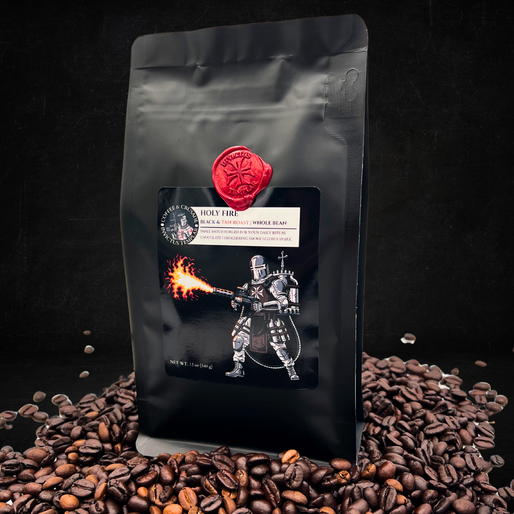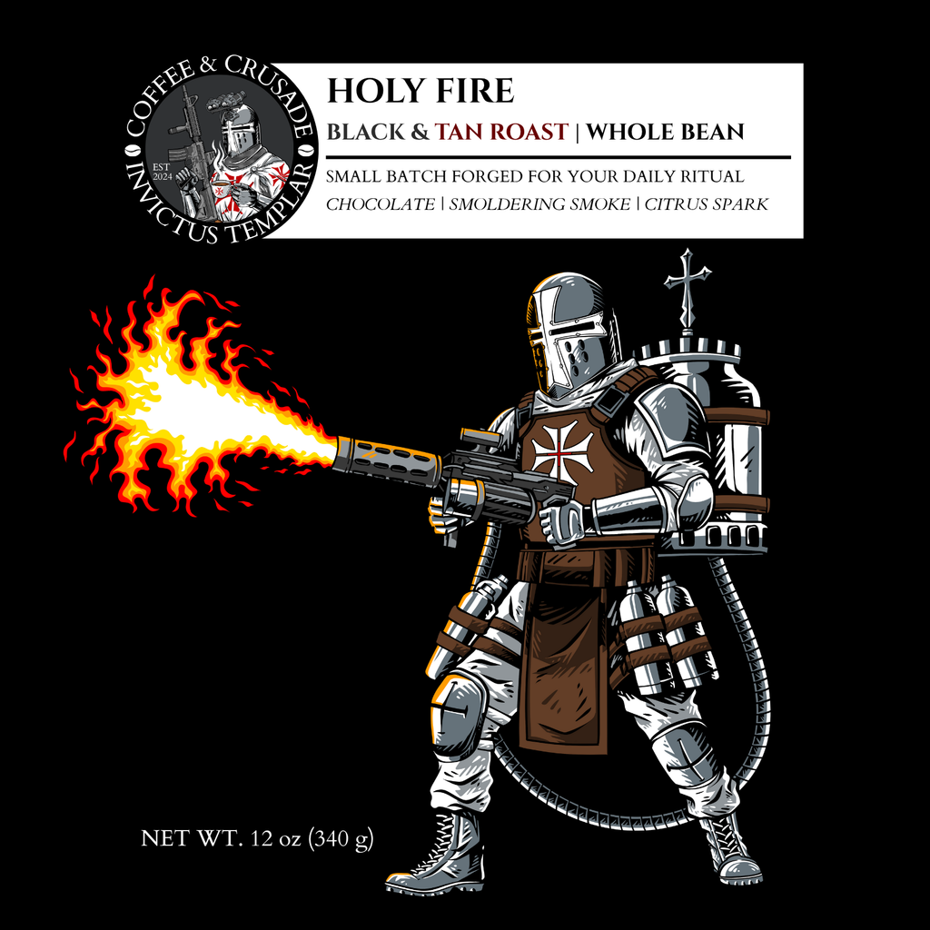 Holy Fire is our signature Black & Tan blend, merging the bright complexity of a light roast with the deep, smoky boldness of a dark roast. Crafted from Guatemalan and Ethiopian beans, this artisan fusion delivers notes of milk chocolate, roasted citrus, and soft smoke. Designed for the discerning warrior, it's the perfect balance of light and dark—refined, invigorating, and battle-ready.