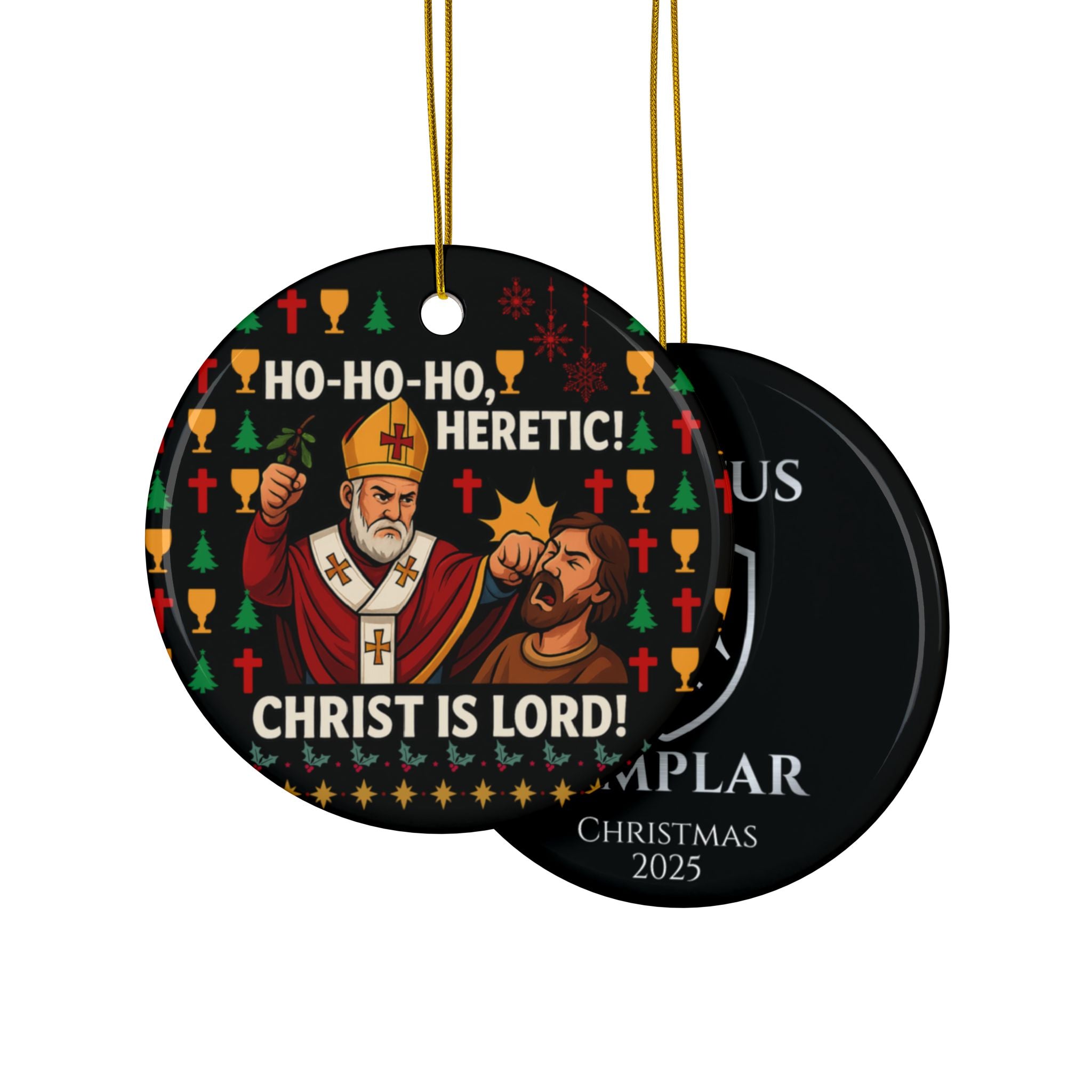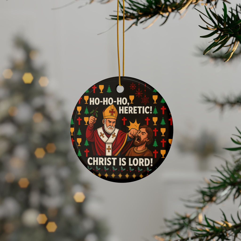 Deck your tree with conviction. This Ho-Ho-Ho, Heretic ceramic ornament features Saint Nicholas delivering swift correction to a heretic, surrounded by festive Christmas symbols (crosses, chalices, trees, snowflakes, and holly). The bold declaration "Ho-Ho-Ho, Heretic! Christ Is Lord!" makes it clear: this ornament celebrates truth, tradition, and unwavering faith. Perfect for believers who want their Christmas tree to reflect their values.