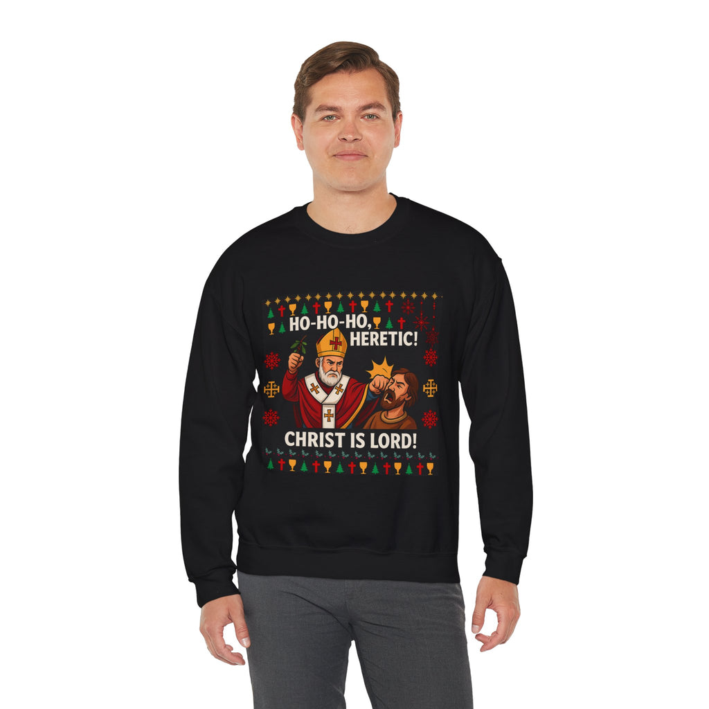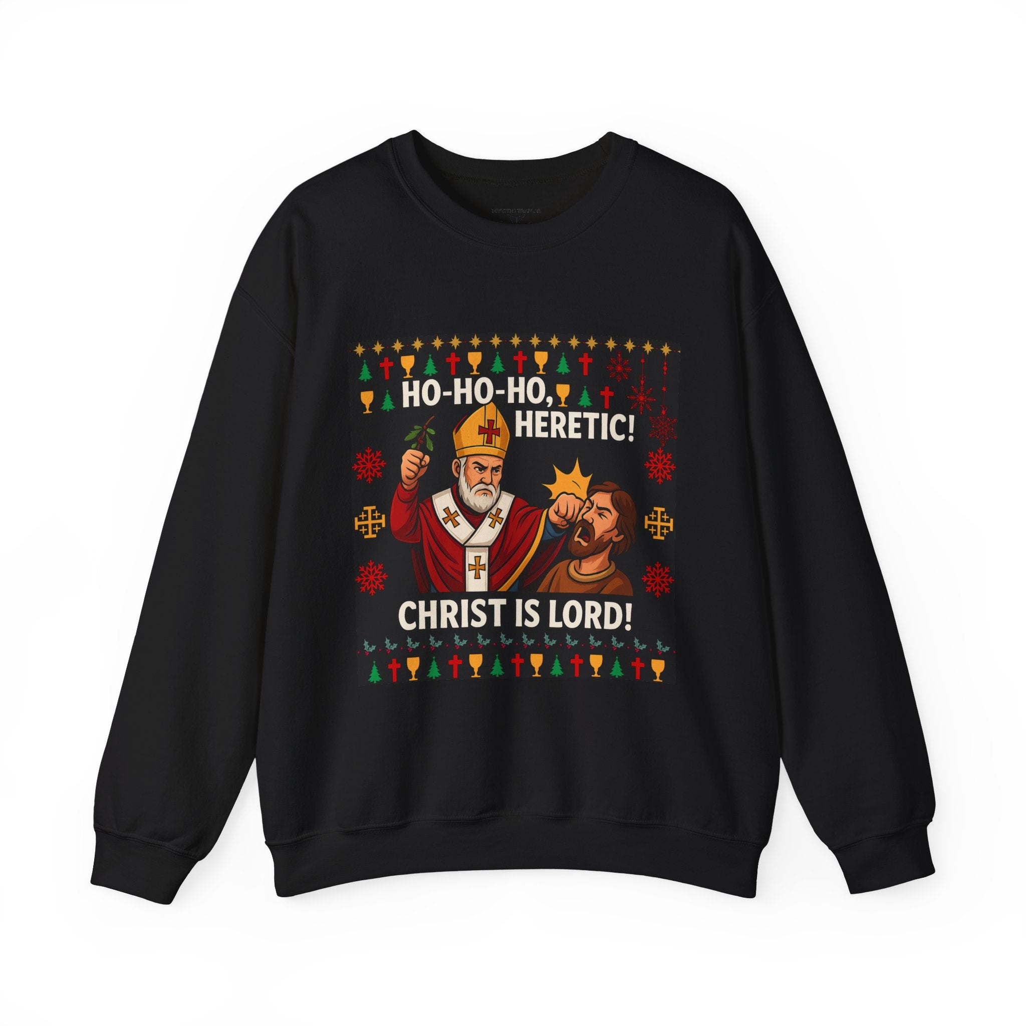 Saint Nicholas doesn't tolerate heresy. This ugly Christmas sweater features a stern Saint Nick wielding mistletoe and delivering swift correction to heresy, surrounded by festive Christmas symbols (stars, crosses, chalices, snowflakes, and holly). The bold declaration "Ho-Ho-Ho, Heretic! Christ Is Lord!" makes it clear: this Christmas season is about truth, tradition, and not compromising on what matters. Perfect for believers who want their holiday spirit served with a side of theological conviction.